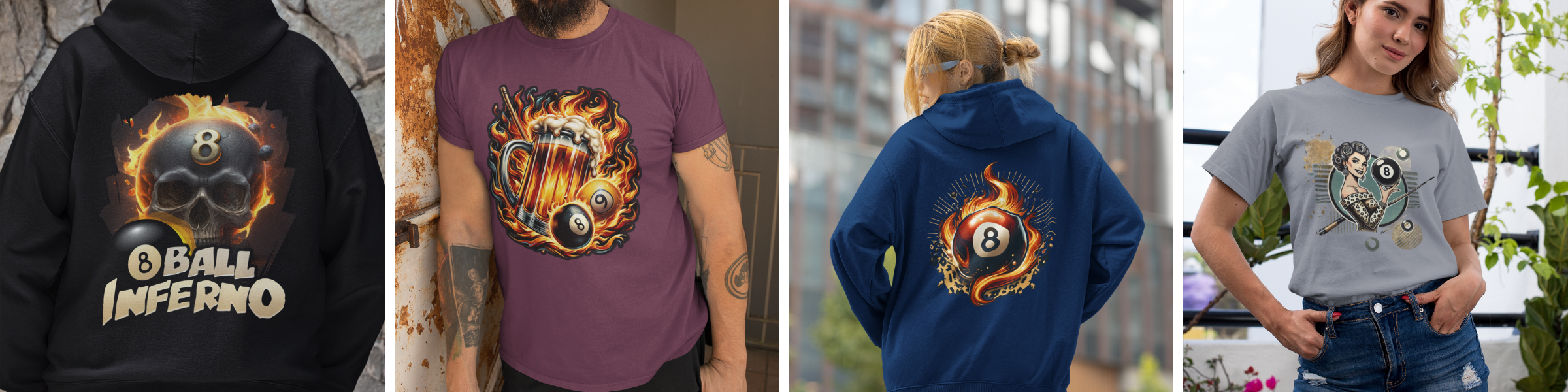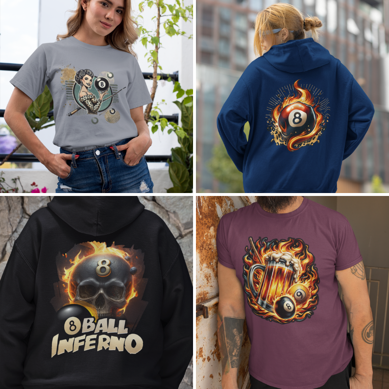 The 8 Ball Pin-Up Hoodie brings together tattoo-style pin-up art and classic 8 ball iconography. It’s edgy, bold, and unapologetically retro—a favourite for players with attitude and style.